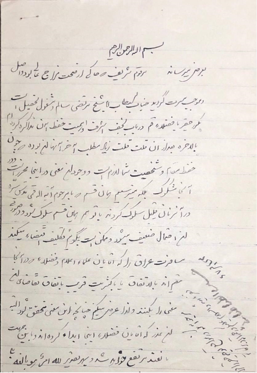 به عرض می رساند مرقوم شریف که حاکی از صحت مزاج عالی بود، واصل و موجب مسرت گردید. جناب مستطاب آقا شیخ مرتضی سالم و مشغول تحصیل است.