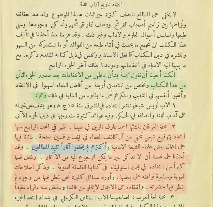 تصویر بالا از کتاب تاریخ آداب اللغه، اشاره به انتقال شیخ محمد حسین کاشف الغطاء در مجله العرفان از بی توجهی جرجی زیدان به آثار شیعه دارد...