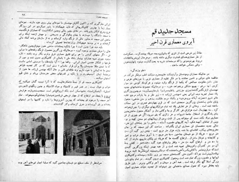 در حالی که معماران و مهندسان و آرشیتکتهای محترم مملکت اغلب در فکر شرکت در مناقصههای دولتی و تأمین معاشند یا در فکر تقلید از معماری غربی با جرزهای هرمی و نشان دادن مقاومت مصالحی که یکجا از فرنگ وارد میشود و هر کودک کودنی در سوار کردن آنها سر هم – به هیچ مشکلی برنخواهد خورد – و در حالیکه مجموعه ساختمانهای جدید مهندسانِ از فرنگبرگشتۀ ما چیزی جز زشتی یا تقلید صرف را به ارمغان نمیآورد – در چنین روزگاری یک معمار تجربهدیدۀ ایرانی یعنی «مهندس لرزاده» - زیر نظر و بنا به ارادۀ مرجع تقلید عالم تشیع «حضرت آیتالله بروجردی» و به کمک مردم علاقمند به مذهب و سنن مذهبی– مشغول پایان دادن به ساختمان بزرگترین مسجدی است که در قرن چهاردهم هجری در این مملکت ساخته شده است و خالی از هر تعاونی یکتنه تمام خرابکاریهای دیگران را جبران خواهد کرد. سه چهار سال است هزاران نفر کارگر و بنا و کاشیساز و آهنکار مشغول ساختن چنین بنای یادگاری از استقلال جامعۀ تشیعاند و هر زائری که به قم میرود اگر هم چیزی از فن معماری درک نکند، دست کم میتواند پس از لذت بردن از زیبائیهای دو صحن کهنه و نو –و پس از تماشای آن همه شکوه آینهکاریهای مقصورۀ آستانه– ساعتی را نیز به تماشای این هنرنمائی جدید متخصصان فن معماری ایران بگذارند.