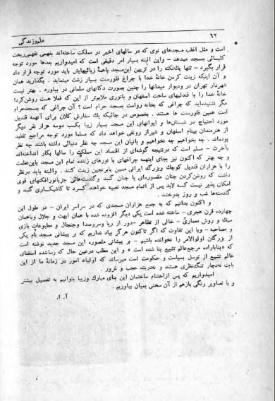 و اکنون بدانیم که به جمع هزاران مسجدی که در سراسر ایران – در طول این چهارده قرن هجری – ساخته شده است یکی دیگر افزوده شده با همان ابهت و جلال و با همان سبک و روش معماری – خالی از تظاهر – دور از ریا و سروصدا و جنجال و مطبوعاتبازی و مصاحبه – و با این تفاوت که اگر تاکنون هرگز بیاد نداریم که بر پیشانی مسجد نام یکی از بزرگان اولوالامر! را نخوانده باشیم – بر پیشانی مقصورۀ این مسجد جدید نوشته است که «بنا به ارادۀ مرجع عالم تشیع بنا شده است» و این مطلب در عین حال که رسانندۀ استغنای عالم تشیع از توسل به سیاست و حکومت است میرساند که اولیاء امور در زمانه ما از این بابت نه دچار تنگنظری هستند و نه دربند عجب و غرور.